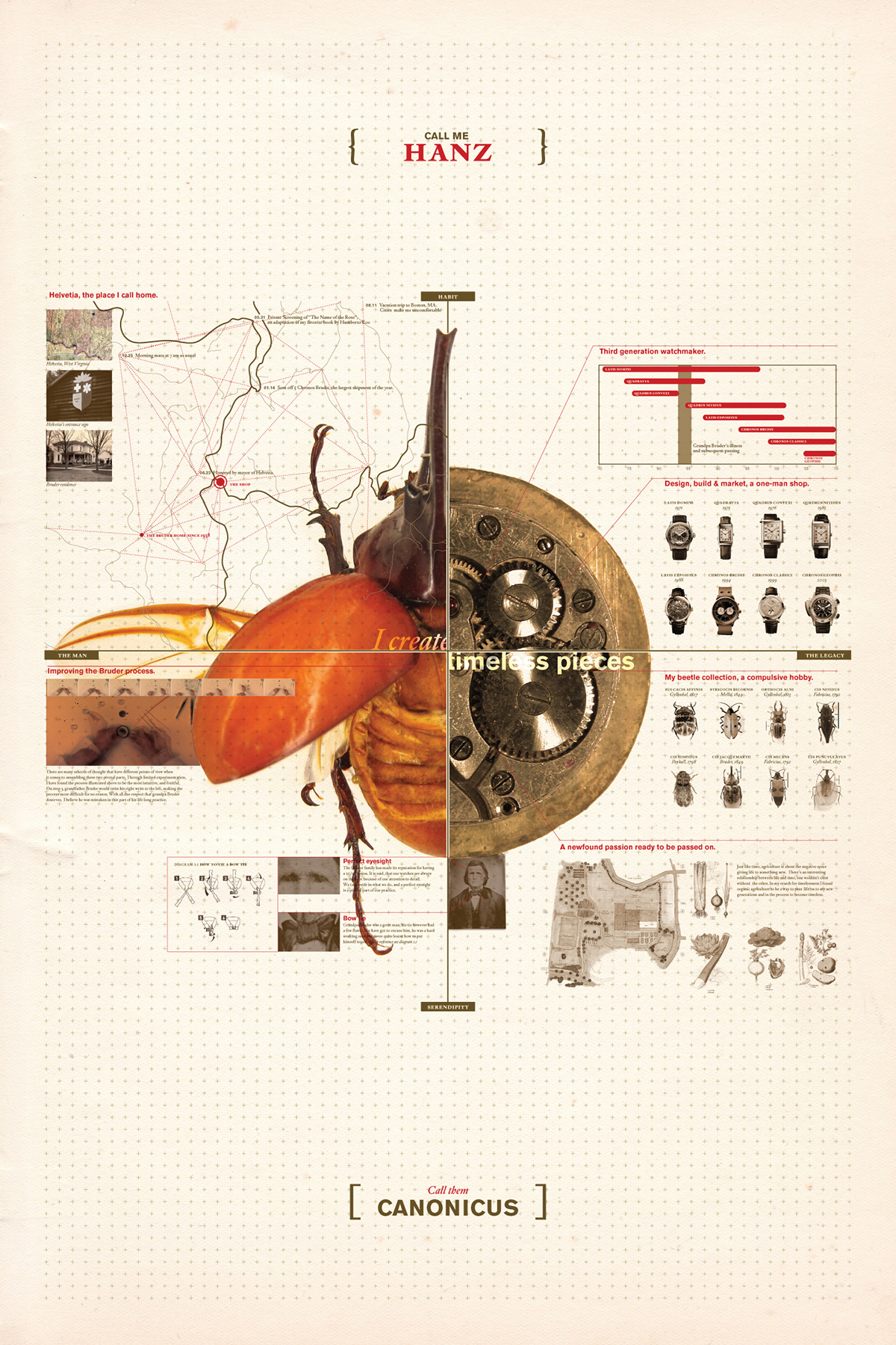 In this study I developed an alternative persona for myself, one that amplifies, undermines, and rediscovers elements of who I am as a designer and where I want to be. Mr. Hanz Bruder, my alter ego, is a third generation swiss watchmaker who collects beetles. After creating a biographical diagram, I produced a new work of design in the mode of Mr. Bruder. In this exercise graphic design becomes a visual performance and as so, the design pieces are a manifestation of a different designer as well as his dialogue with design as a discipline.
