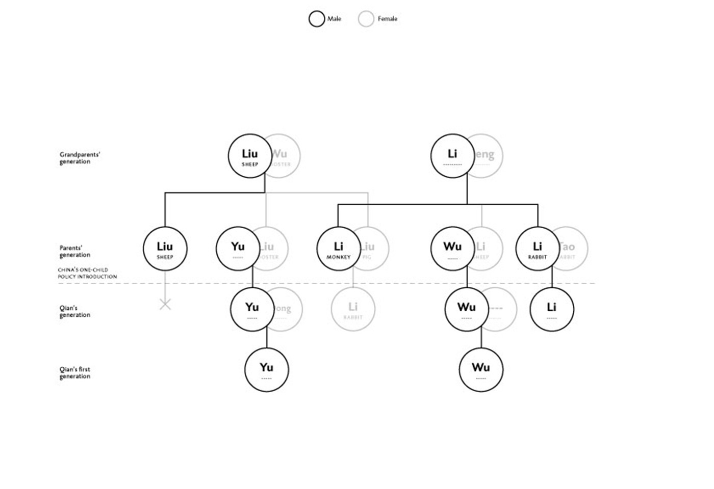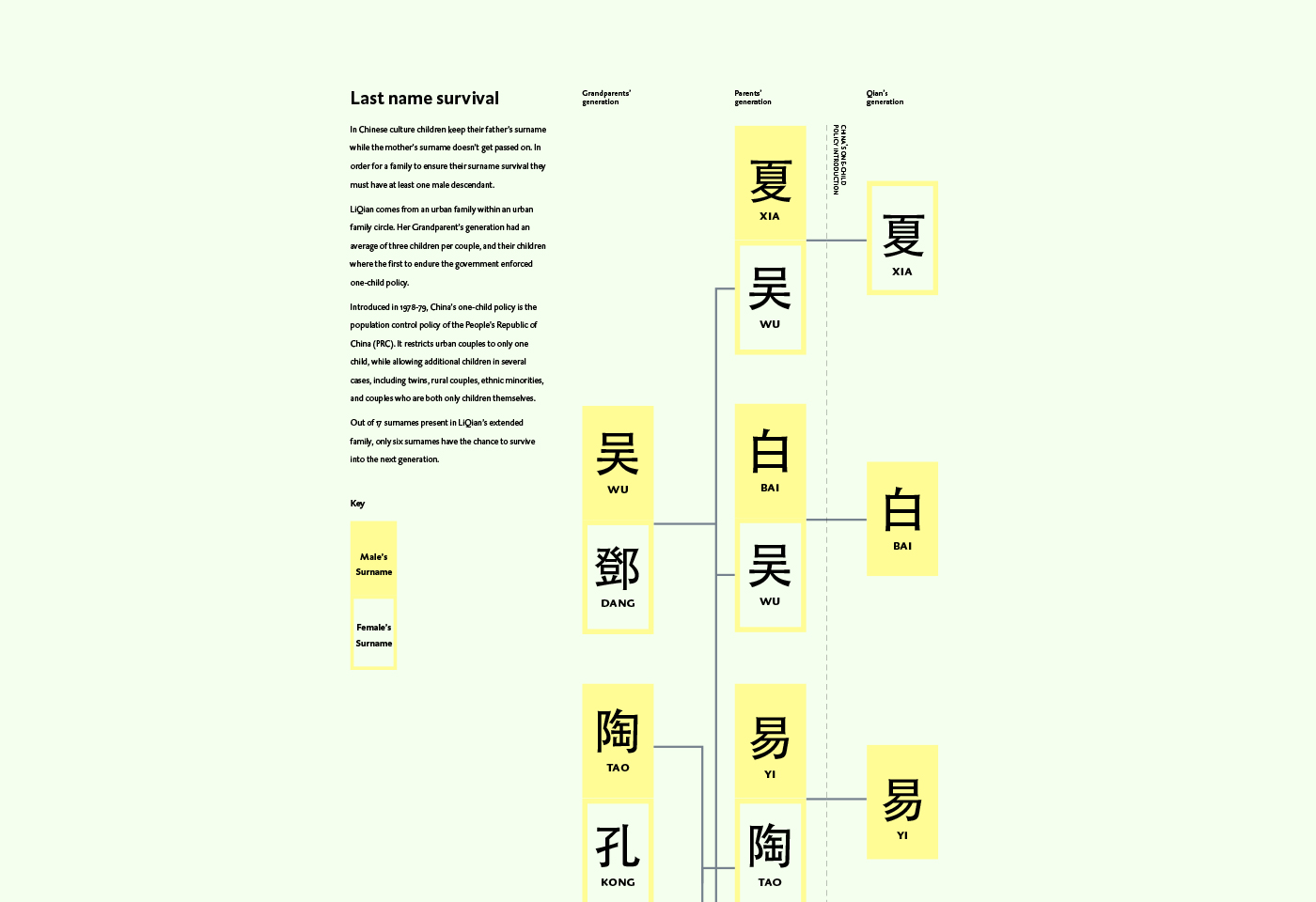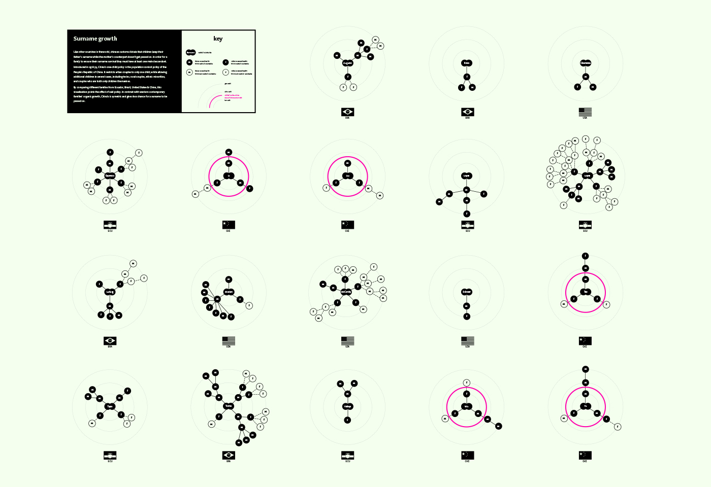 By comparing different families from around the world to Chinese families, this visualization points the effect of said policy. In contrast with western contemporary families' organic growth, their Chinese counterparts are symmetric, reducing the chance for a surname to be passed on.